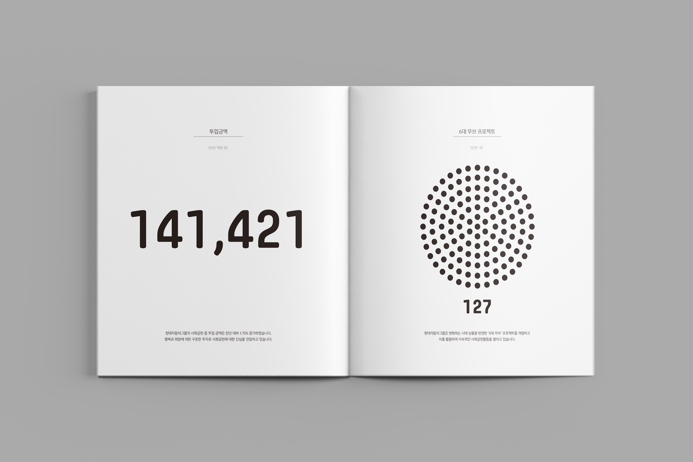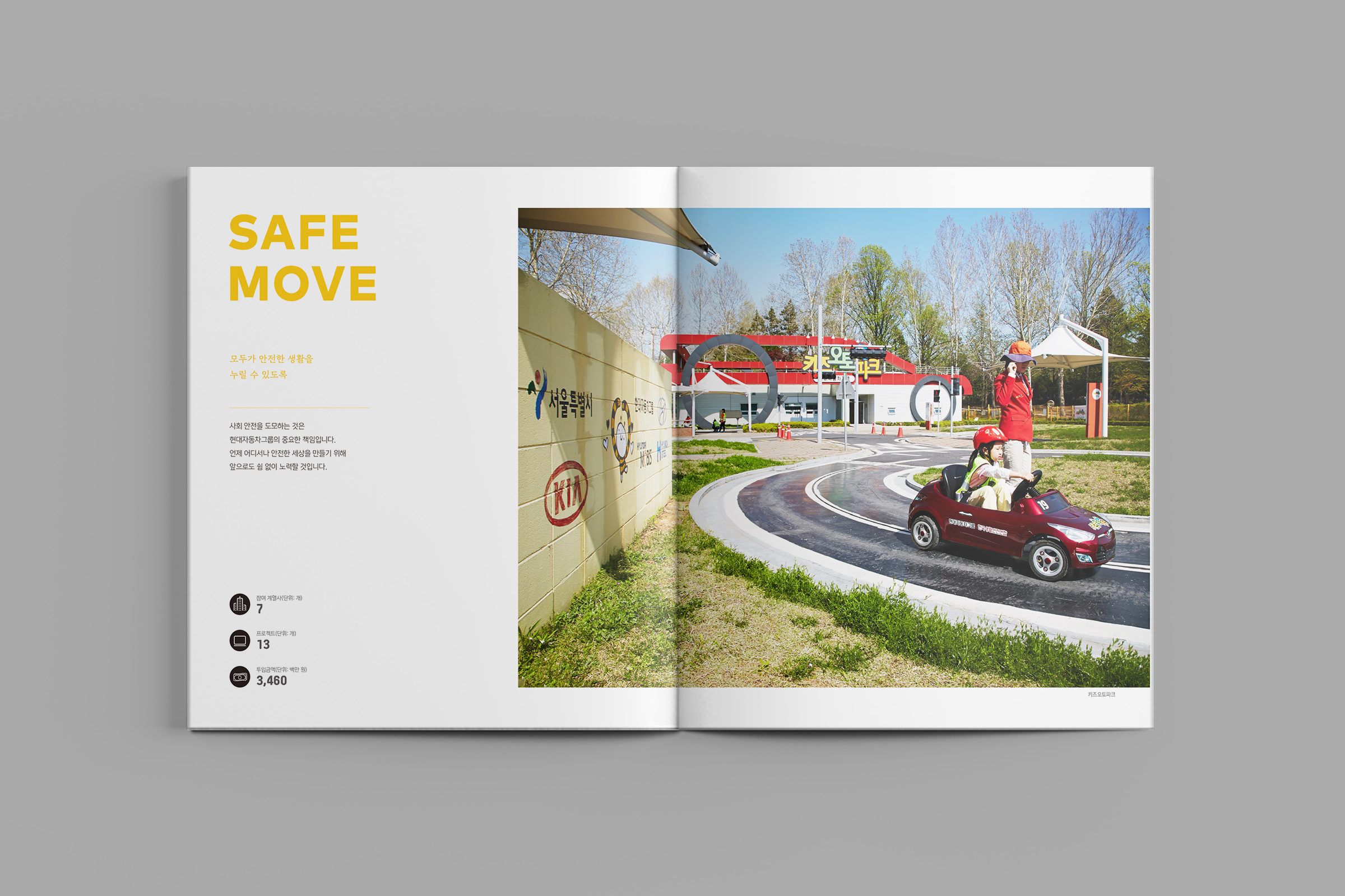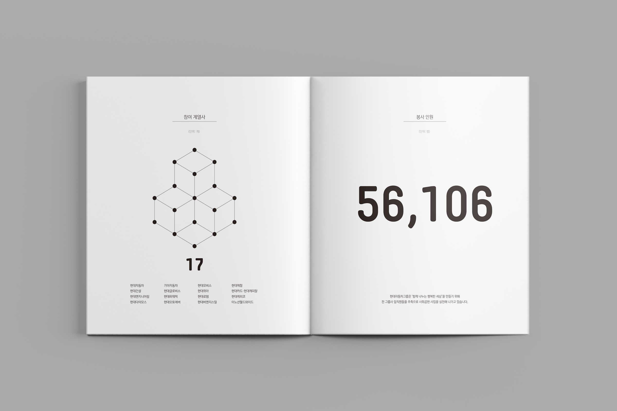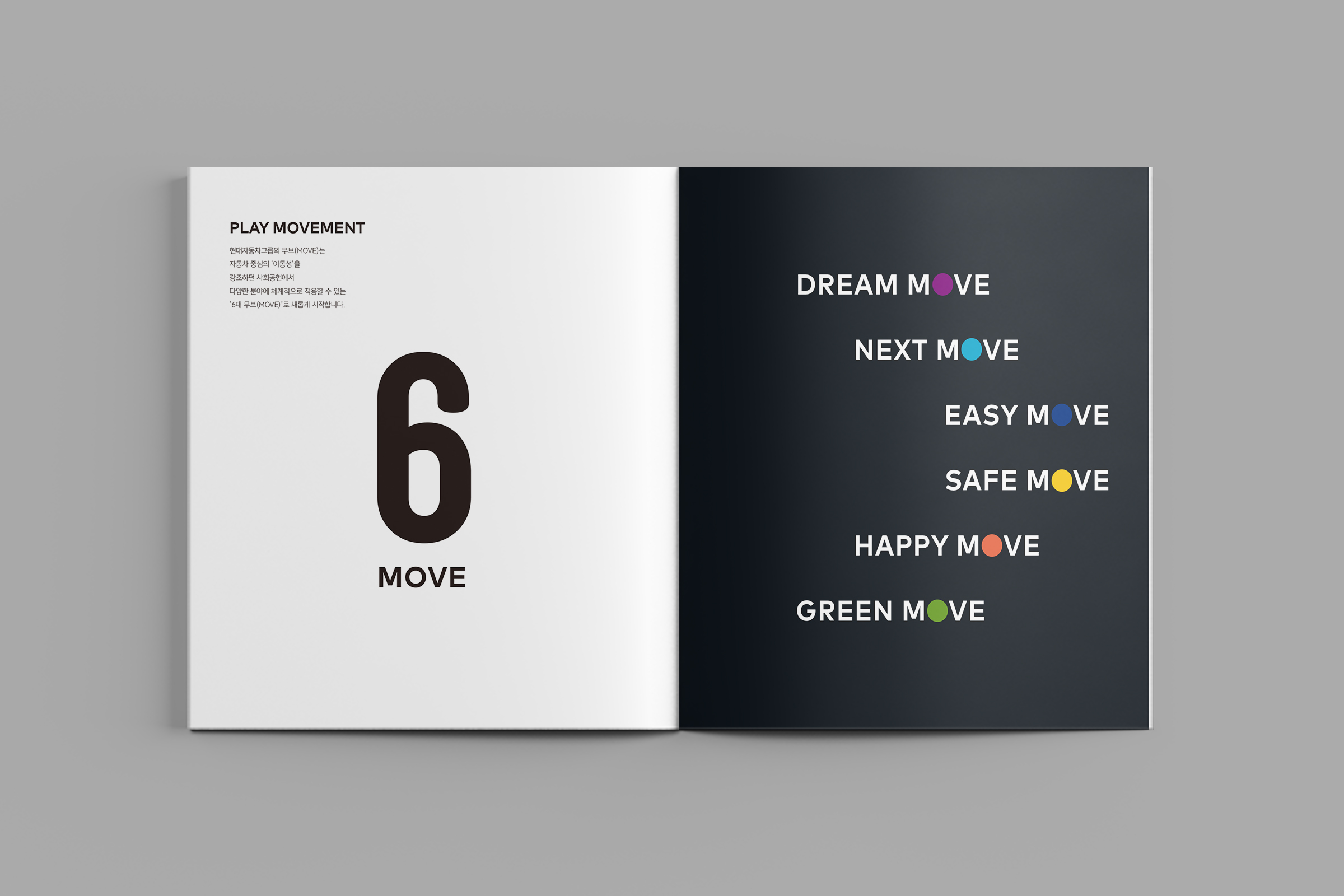 현대자동차그룹 2015년 사회공헌 활동백서는 현대 자동차그룹의 사회공헌 활동이 사회에 가져온 ‘긍정적인 움직임(MOVEMENT)’을 대주제로 현대자동차그룹의 사회공헌 체계인 6대 무브와 주요활동, 각 계열사별 사회공헌 활동철학을 담았습니다. 표지부터 내지까지 도트(dot)를 일관되게 사용하여 각 계열사의 유기적인 사회공헌활동이 사회에 가져온 긍정적인 움직임을 은유적으로 표현하였습니다.